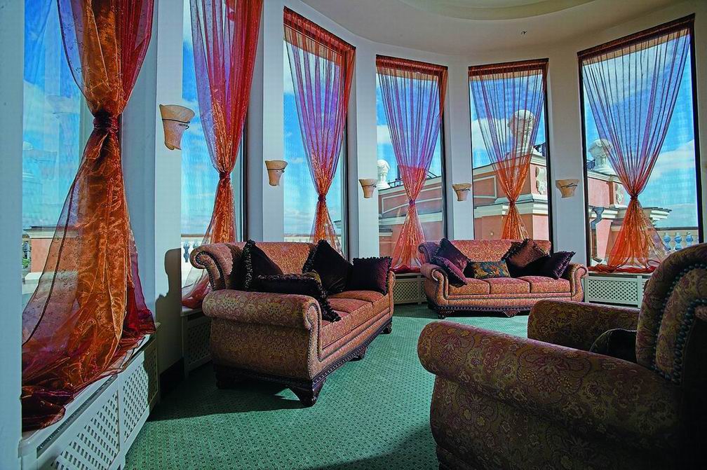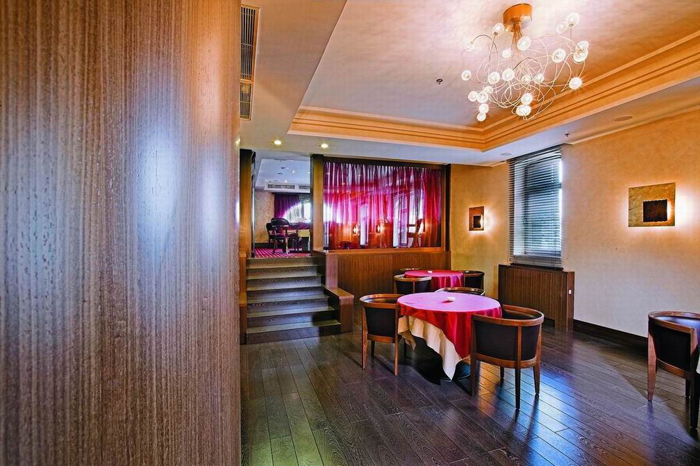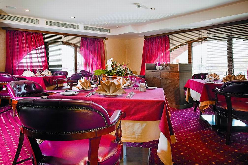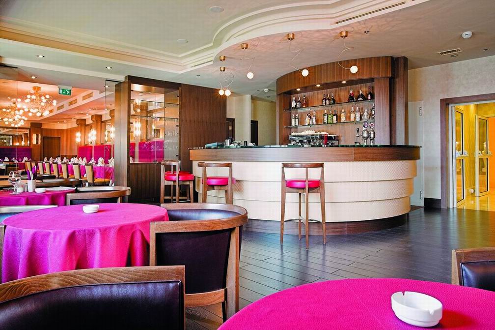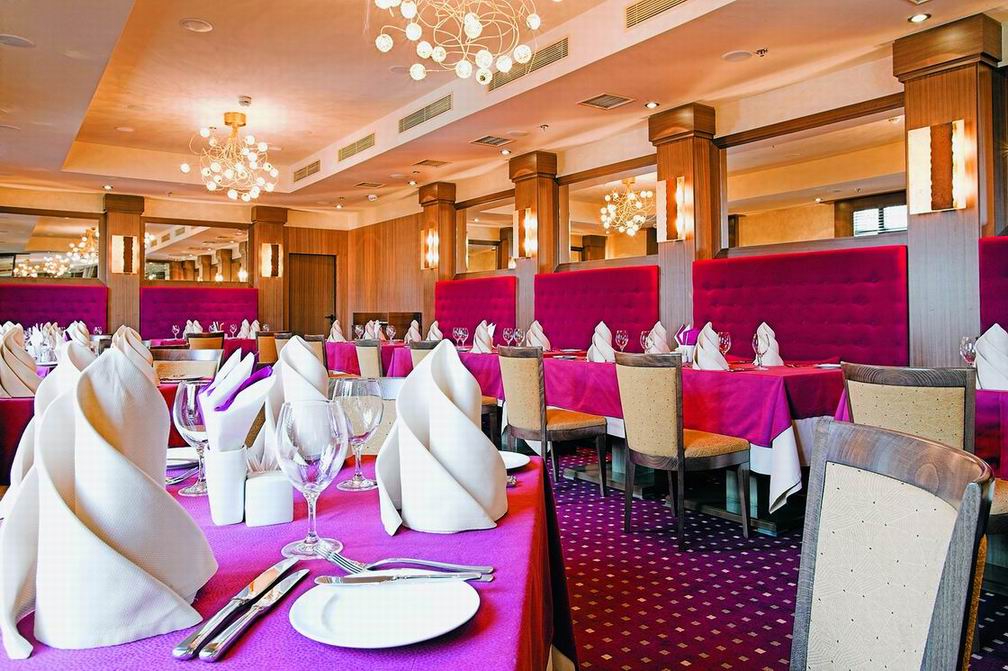 Комфорт и гармоничная красота, песелившиеся в каждом уголке отеля, безусловно придутся по вкусу постояльцам, решившим совместить туризм и отдых в столичном городе. Благородная бордовая гамма превалирует в оформлении интерьера ресторана. Полукруглые широкие окна дают возможность наслаждаться красотой водного пейзажа. Уютом и деловым настроением наполнена комната для отдыха. Серые и темно-голубые тона мягких диванов, зеркальный блеск журнальных столиков и изысканность белых портьер создают максимально комфортную атмосферу, как для деловой беседы, так и для приятного расслабления. В соответствии с лучшими традициями ресторанного дела, барная стойка привлекает блеском хрусталя и изобилием всевозможных напитков.