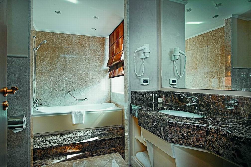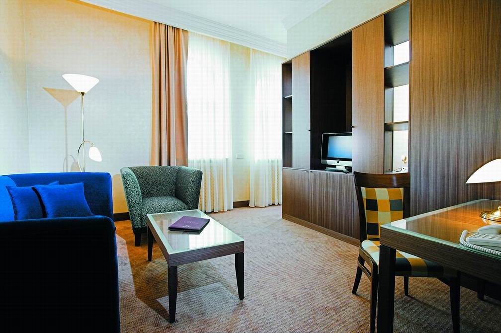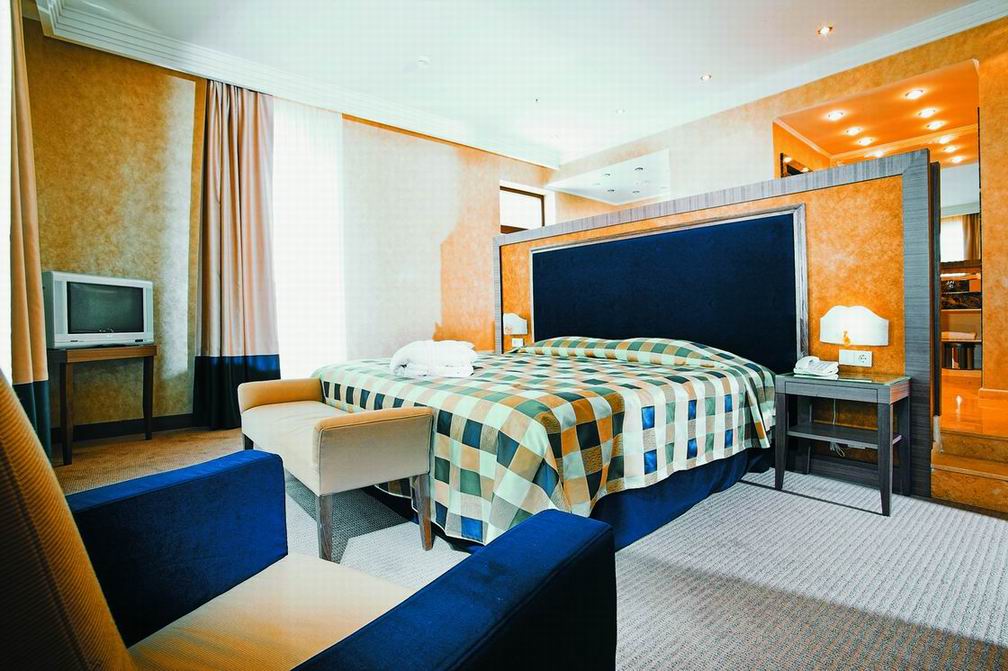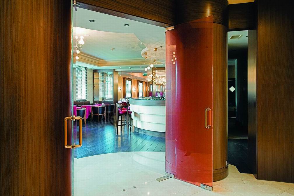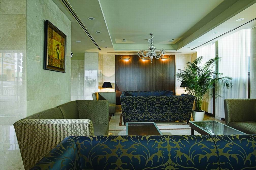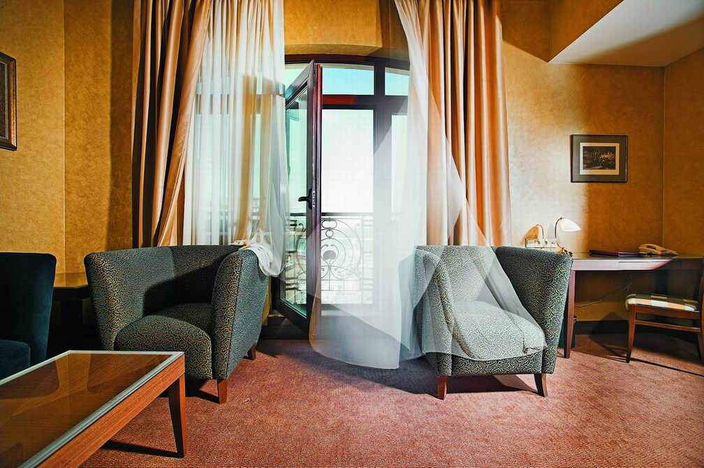Комфорт и гармоничная красота, песелившиеся в каждом уголке отеля, безусловно придутся по вкусу постояльцам, решившим совместить туризм и отдых в столичном городе. Благородная бордовая гамма превалирует в оформлении интерьера ресторана. Полукруглые широкие окна дают возможность наслаждаться красотой водного пейзажа. Уютом и деловым настроением наполнена комната для отдыха. Серые и темно-голубые тона мягких диванов, зеркальный блеск журнальных столиков и изысканность белых портьер создают максимально комфортную атмосферу, как для деловой беседы, так и для приятного расслабления. В соответствии с лучшими традициями ресторанного дела, барная стойка привлекает блеском хрусталя и изобилием всевозможных напитков.