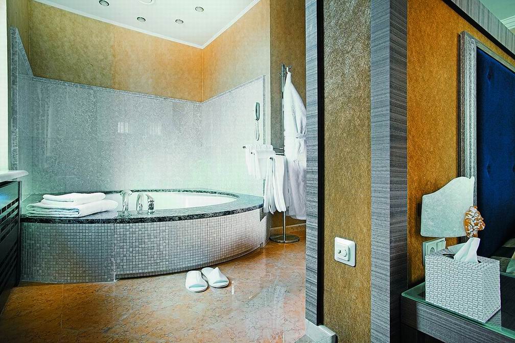 Особенным шармом отличаются ванные комнаты. Широкие вместительные чаши ванных украшены эксклюзивной кафельной плиткой, красота которой эффектно отражается в множественных зеркалах.