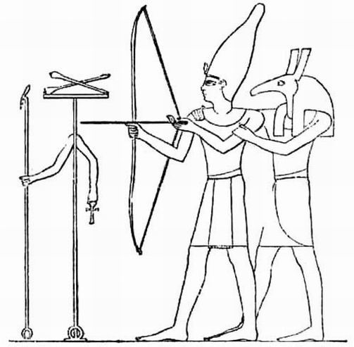 Рис.: Сетх учит Тутмоса III стрельбе из лука. Перед царем — символ богини Нейт (две стрелы на штандарте)
